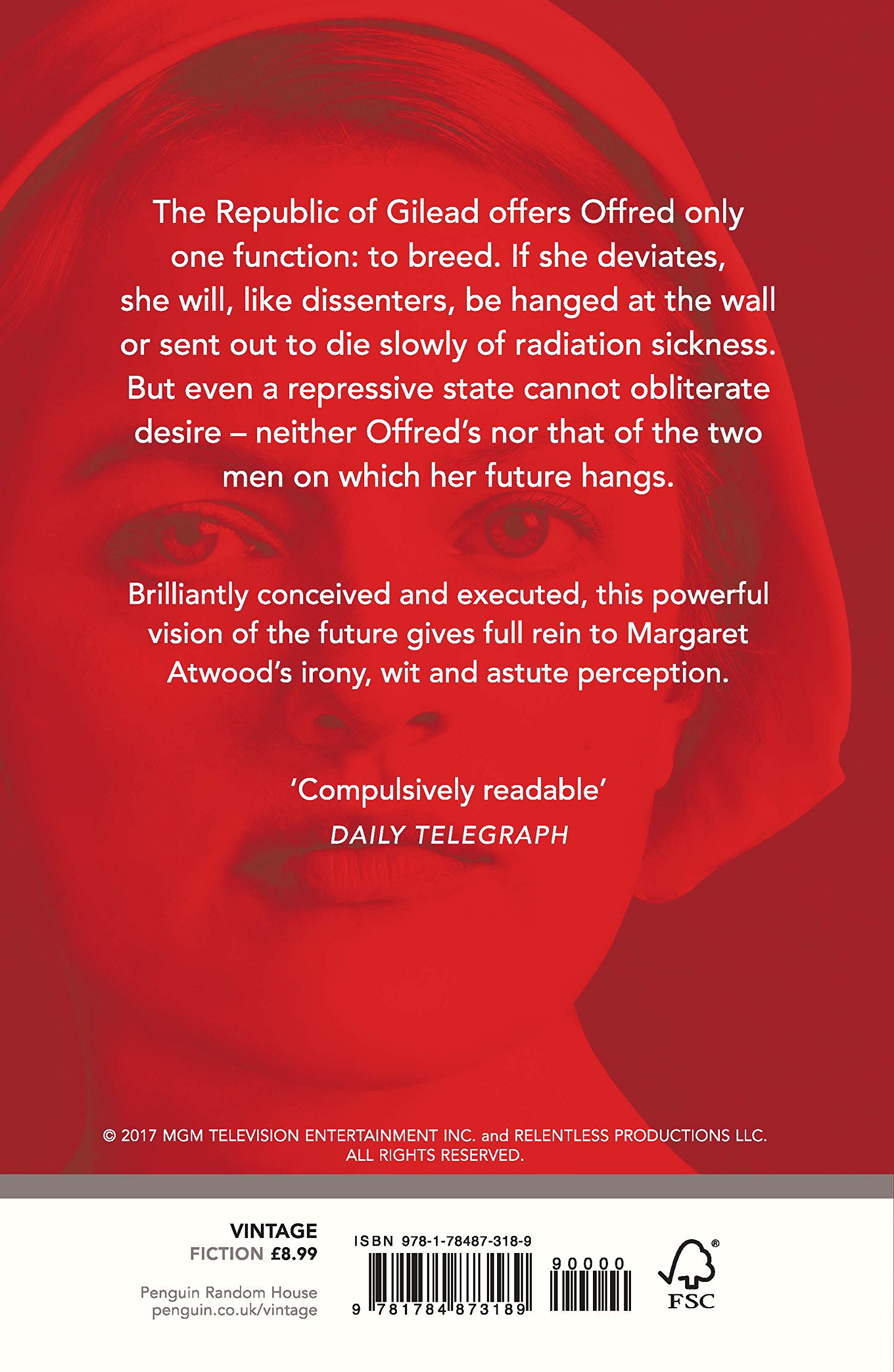 Offred is a Handmaid in The Republic of Gilead, a religious totalitarian state in what was formerly known as the United States. She is placed in the household of The Commander, Fred Waterford – her assigned name, Offred, means ‘of Fred’. She has only one function: to breed. If Offred refuses to enter into sexual servitude to repopulate a devastated world, she will be hanged. Yet even a repressive state cannot eradicate hope and desire. As she recalls her pre-revolution life in flashbacks, Offred must navigate through the terrifying landscape of torture and persecution in the present day, and between two men upon which her future hangs.