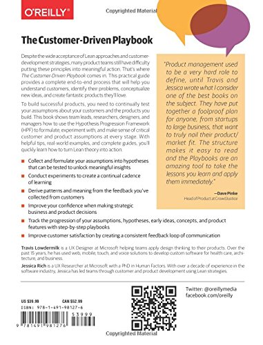 Despite the wide acceptance of Lean approaches and customer-development strategies, many product teams still have difficulty putting these principles into meaningful action. That's where The Customer-Driven Playbook comes in. This practical guide provides a complete end-to-end process that will help you understand customers, identify their problems, conceptualize new ideas, and create fantastic products they'll love. To build successful products, you need to continually test your assumptions about your customers and the products you build. This book shows team leads, researchers, designers, and managers how to use the Hypothesis Progression Framework (HPF) to formulate, experiment with, and make sense of critical customer and product assumptions at every stage. With helpful tips, real-world examples, and complete guides, you'll quickly learn how to turn Lean theory into action. Collect and formulate your assumptions into hypotheses that can be tested to unlock meaningful insights Conduct experiments to create a continual cadence of learning Derive patterns and meaning from the feedback you've collected from customers Improve your confidence when making strategic business and product decisions Track the progression of your assumptions, hypotheses, early ideas, concepts, and product features with step-by-step playbooks Improve customer satisfaction by creating a consistent feedback loop