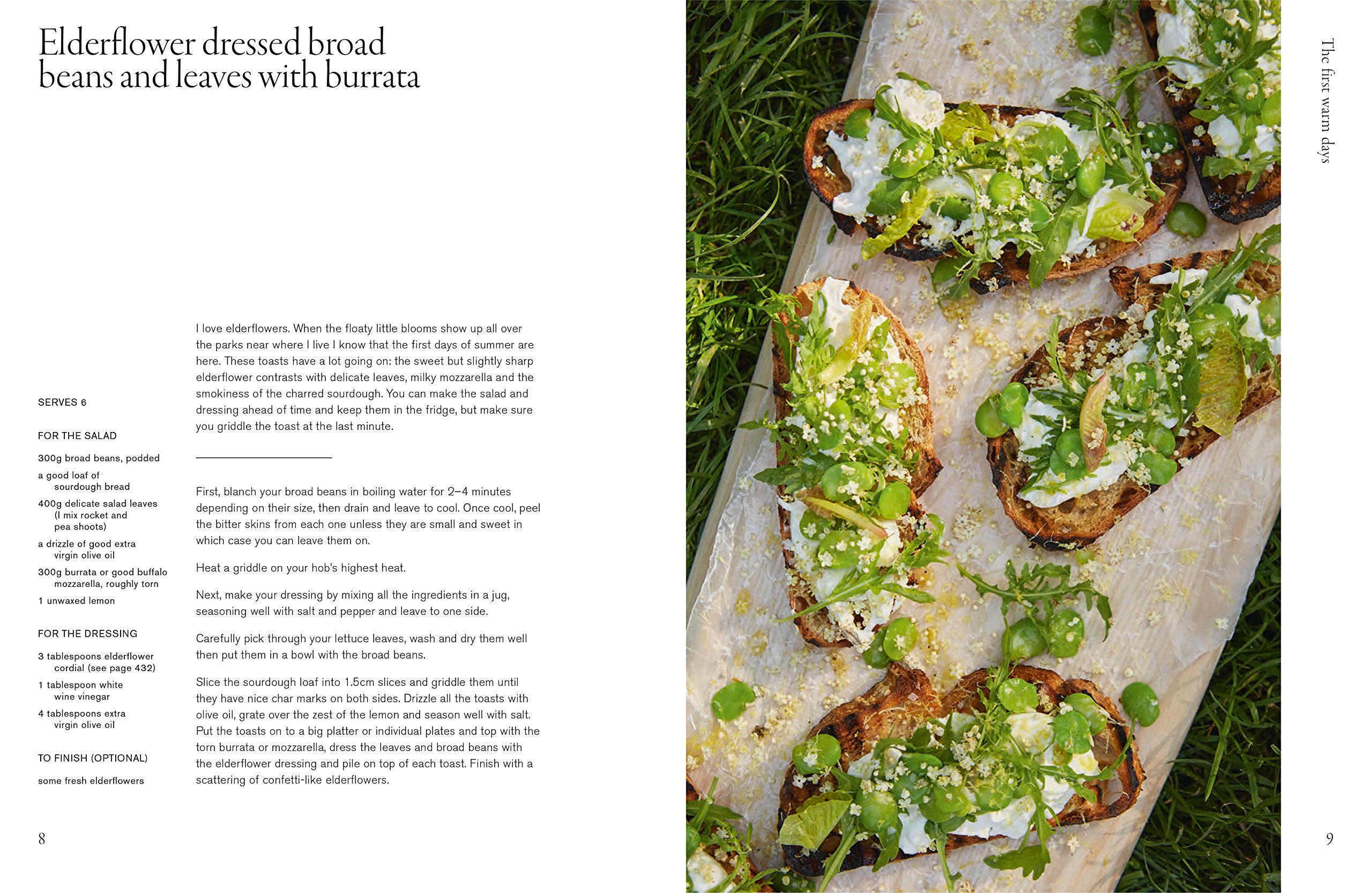 Start of the Year: Spelt with pickled pears and pink leaves and Chocolate and blood orange freezer cake; First Warm Days of Spring: Elderflower dressed broad beans and leaves with burrata and Chickpea farinata with slow cooked courgettes; Herald of Spring: Spring chickpea soup with salted lemons and Rhubarb and rose geranium frozen yoghurt; Summer: Smoked aubergine flatbreads and Beetroot tops tart; Autumn: Orzo with tomatoes and feta and Honey, lemon and coriander seed cake; Winter: Velvet squash broth with miso and soba and Chocolate rye porridge with quick honey pears.