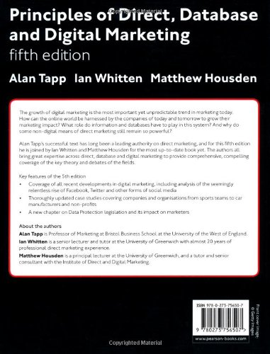 Alan Tapp’s successful text has long been a leading authority on direct marketing, and for this fifth edition he is joined by Ian Whitten and Matthew Housden for the most up-to-date book yet. The authors all bring great expertise across direct, database and digital marketing to provide comprehensive, compelling coverage of the key theory and debates of the fields.