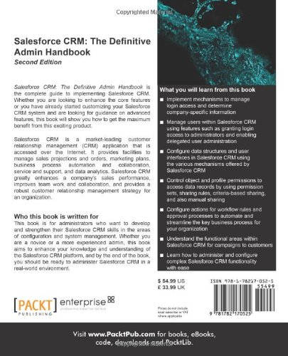 Salesforce CRM: The Definitive Admin Handbook is the complete guide to implementing Salesforce CRM. Whether you are looking to enhance the core features or you have already started customizing your Salesforce CRM system and are looking for guidance on advanced features. This book will show you how to get maximum benefit from this exciting product.