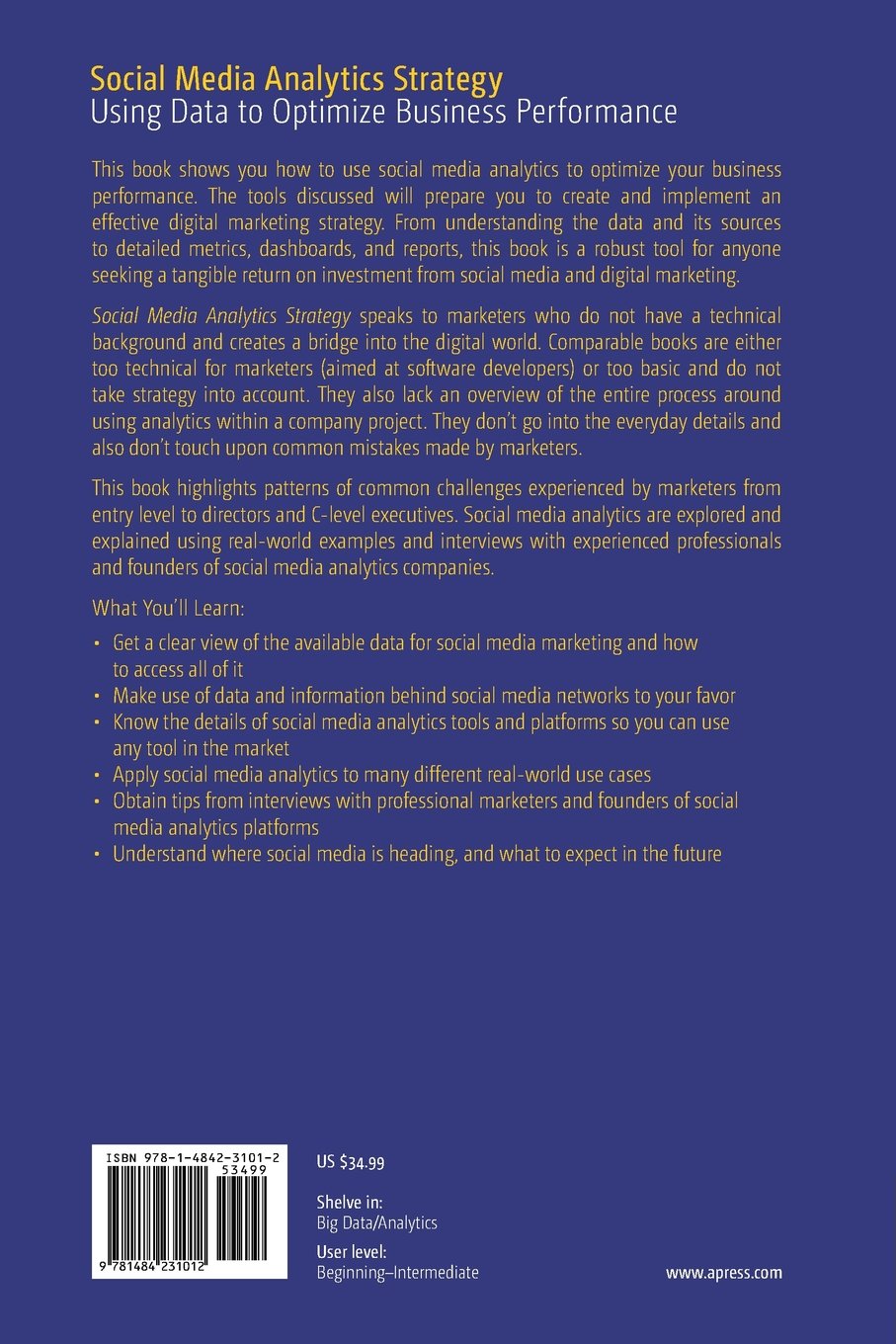This book shows you how to use social media analytics to optimize your business performance. The tools discussed will prepare you to create and implement an effective digital marketing strategy. From understanding the data and its sources to detailed metrics, dashboards, and reports, this book is a robust tool for anyone seeking a tangible return on investment from social media and digital marketing. Social Media Analytics Strategy speaks to marketers who do not have a technical background and creates a bridge into the digital world. Comparable books are either too technical for marketers (aimed at software developers) or too basic and do not take strategy into account. They also lack an overview of the entire process around using analytics within a company project. They don't go into the everyday details and also don't touch upon common mistakes made by marketers. This book highlights patterns of common challenges experienced by marketers from entry level to directors and C-level executives. Social media analytics are explored and explained using real-world examples and interviews with experienced professionals and founders of social media analytics companies. What You'll Learn Get a clear view of the available data for social media marketing and how to access all of it Make use of data and information behind social media networks to your favor Know the details of social media analytics tools and platforms so you can use any tool in the market Apply social media analytics to many different real-world use cases Obtain tips from interviews with professional marketers and founders of social media analytics platforms Understand where social media is heading, and what to expect in the future Who This Book Is For Marketing professionals, social media marketing specialists, analysts up to directors and C-level executives, marketing students, and teachers of social media analytics/social media marketing