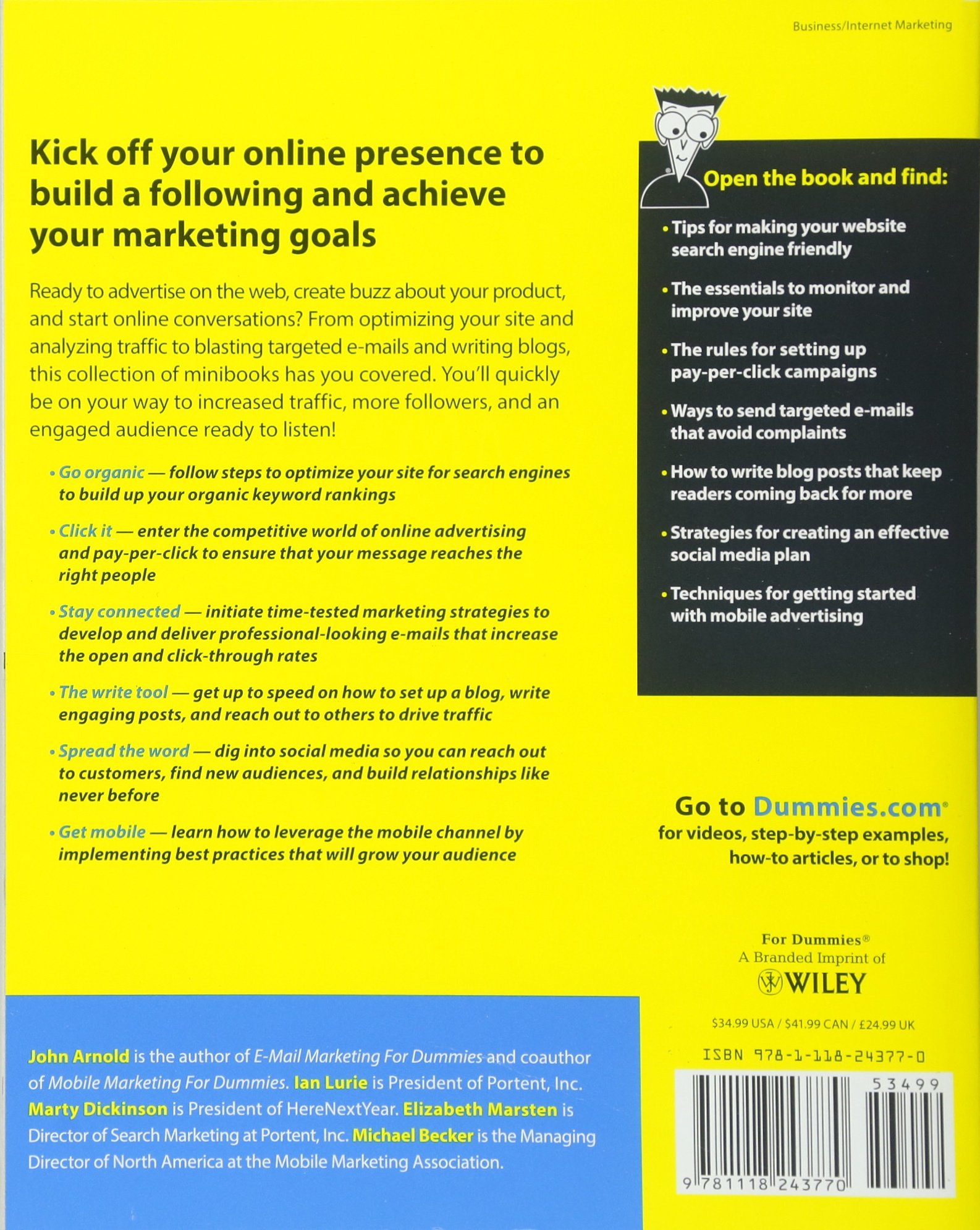 Build an online presence for your business with web marketing Why buy several books on web marketing when you can buy just one? With this must-have resource, five marketing professionals team up to share their expertise in the field of web marketing so that you can benefit from their know-how. Covering everything from site building, search engine optimization, and web analytics to online advertising, e-mail marketing, and harnessing the potential of social media, this team of web marketing gurus brings their insight and experience to the table and it's yours for the taking. * Provides invaluable advice for establishing a web presence and getting your message out with online advertising * Zeroes in on search engine optimization so that your site can be discovered by search engines and, ultimately, consumers * Explains how web analytics can offer you a better understanding of your web marketing efforts * Details ways to establish an online voice with blogging and podcasting * Walks you through the potential of social media marketing with Facebook, Twitter, and Google+ * Looks at various options for getting your message onto mobile platforms Web Marketing All in One For Dummies, 2nd Edition shows you how to get your online name out there so that customers can find you easily.